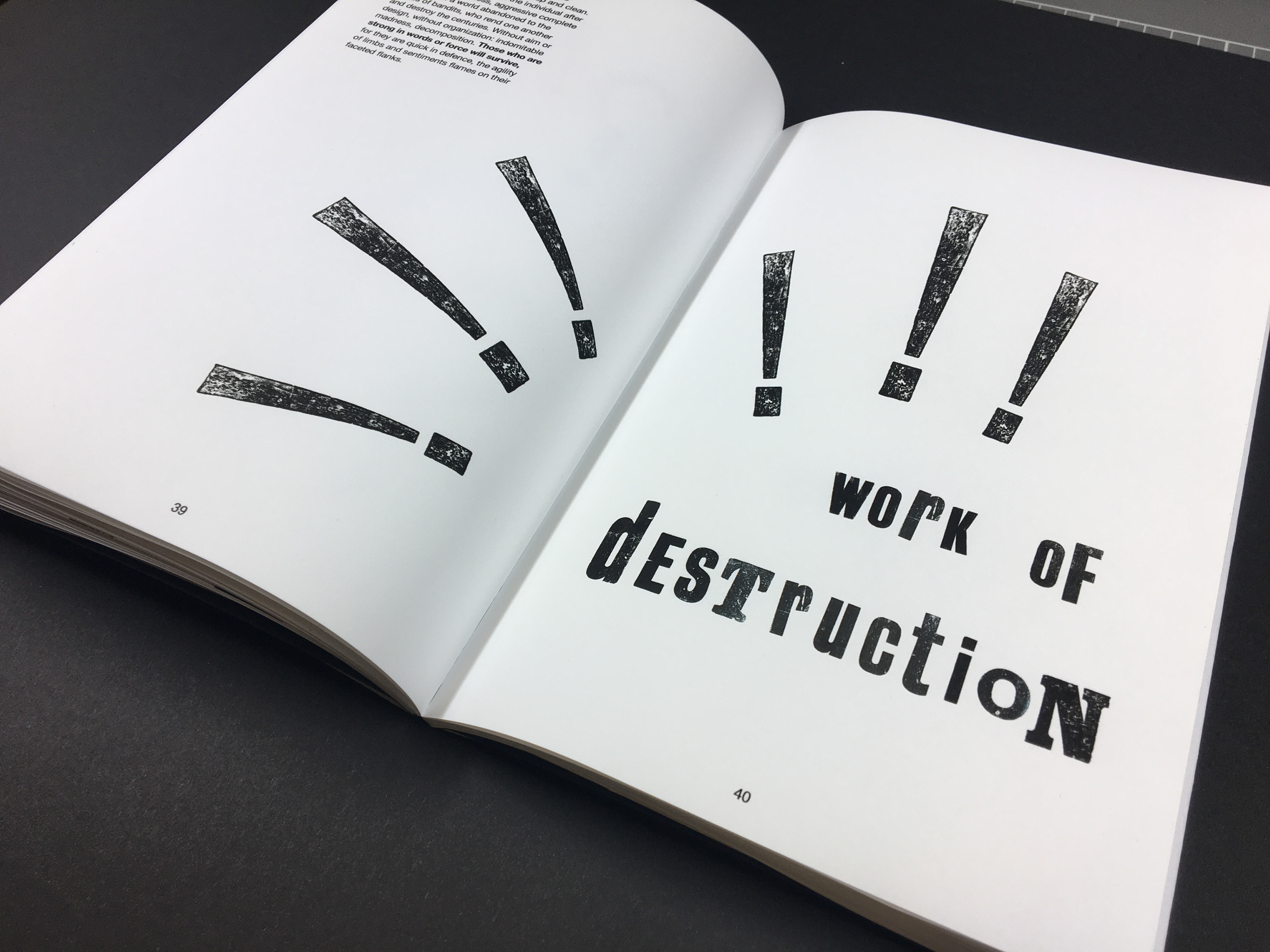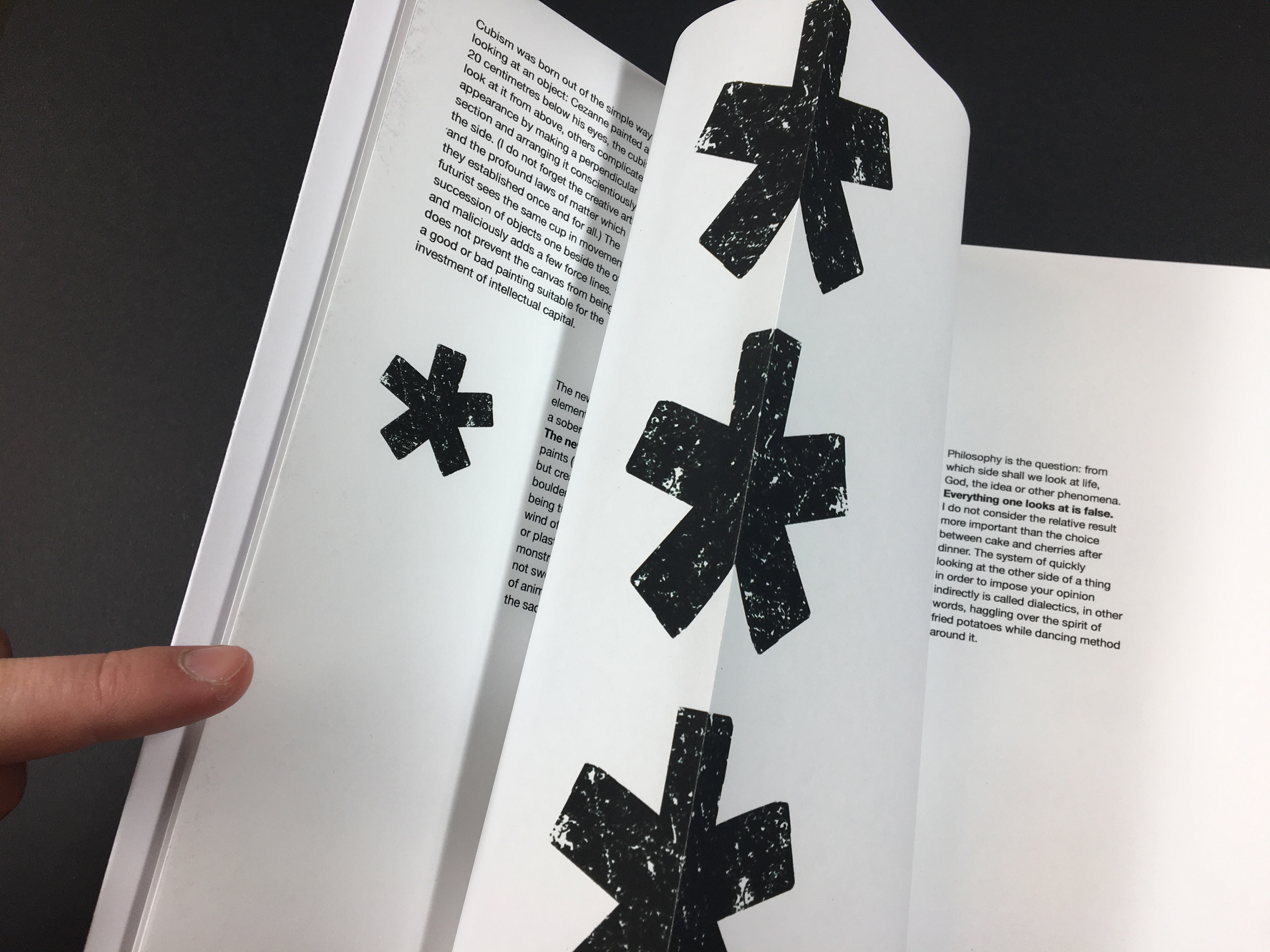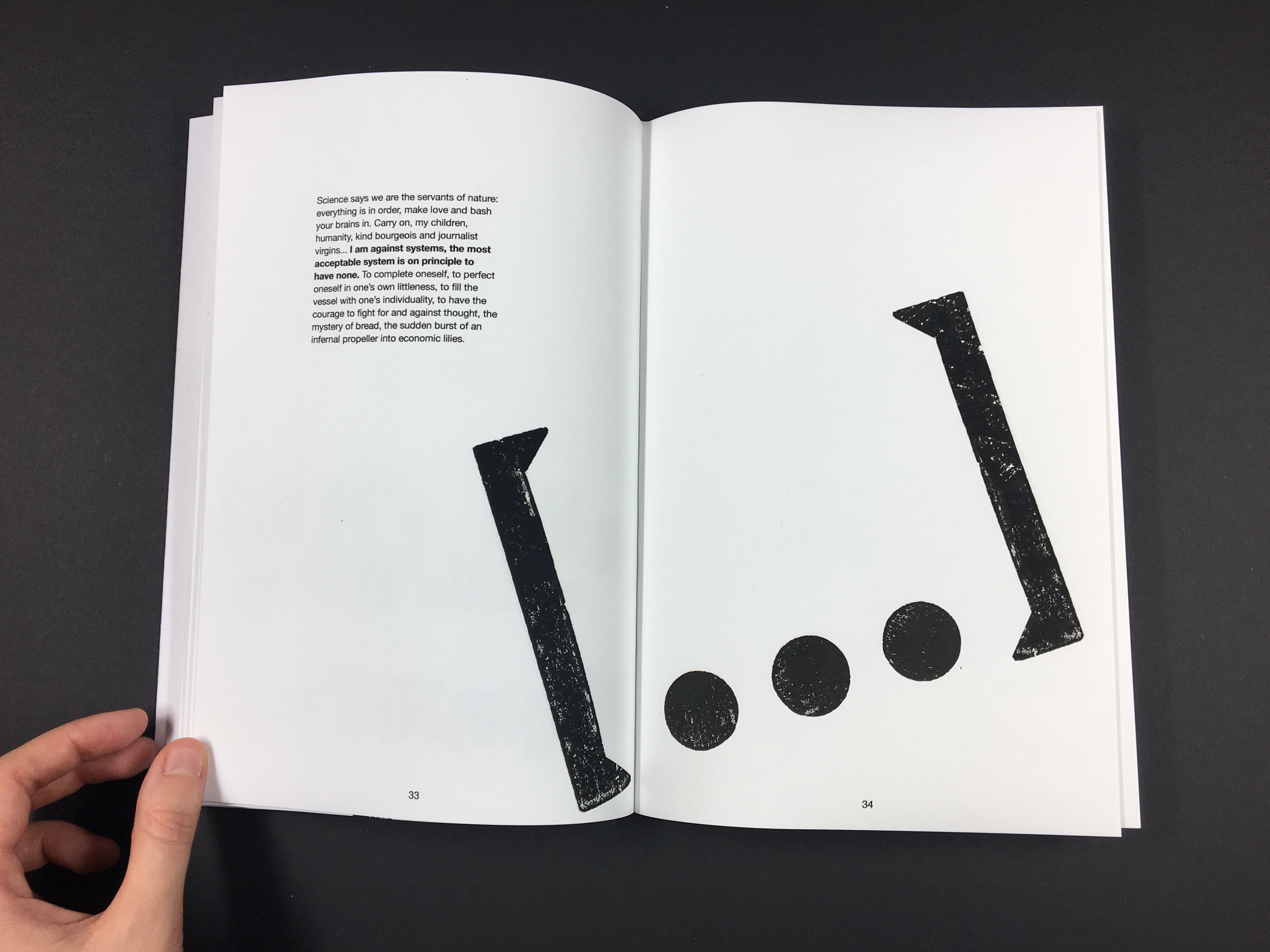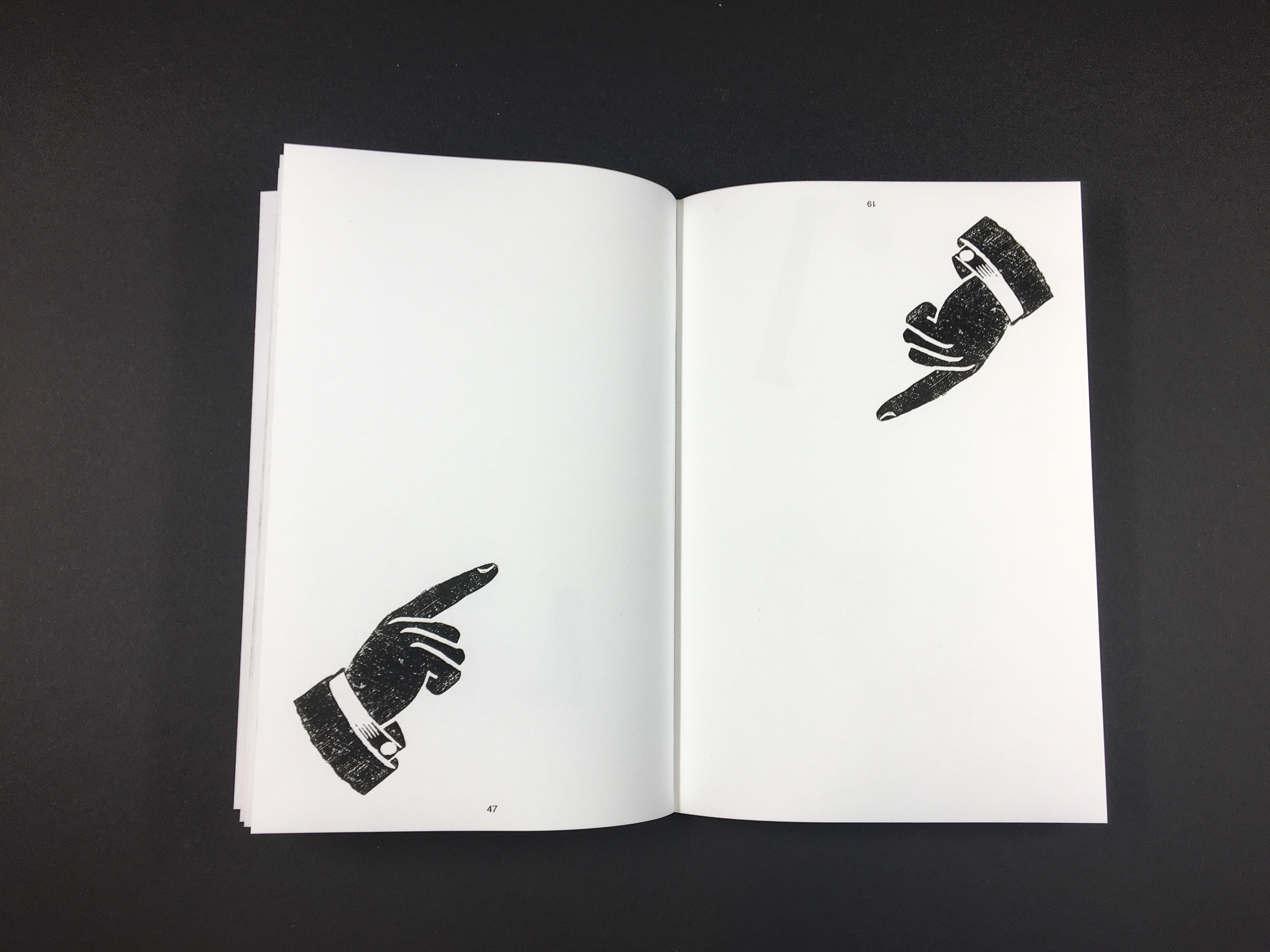 Embracing the Dadaist principle of disruption and unconventional reading, the layout allows the text to be approached from either end of the book, with the narrative flowing in both directions. When the two texts meet, pointing fingers indicate the change in orientation, prompting the reader to rotate the book and continue reading.