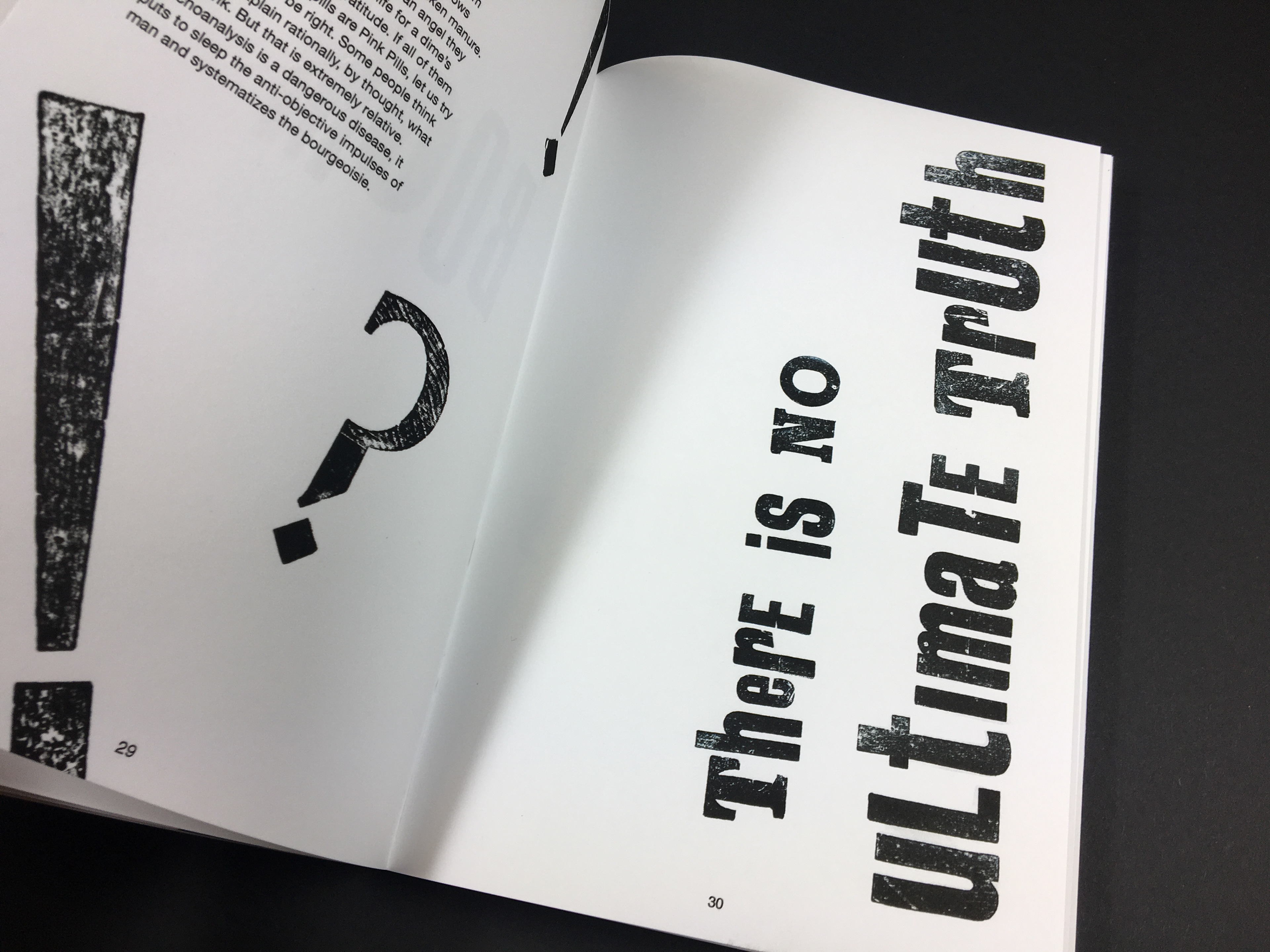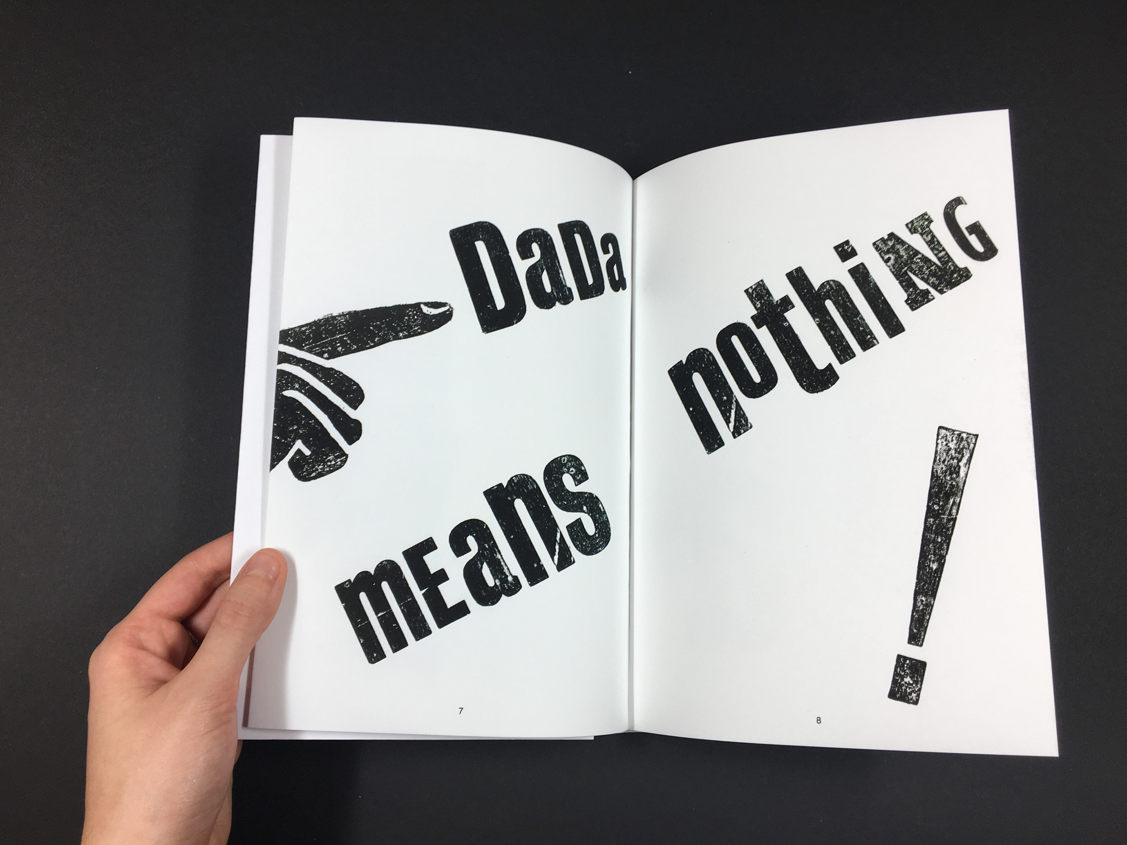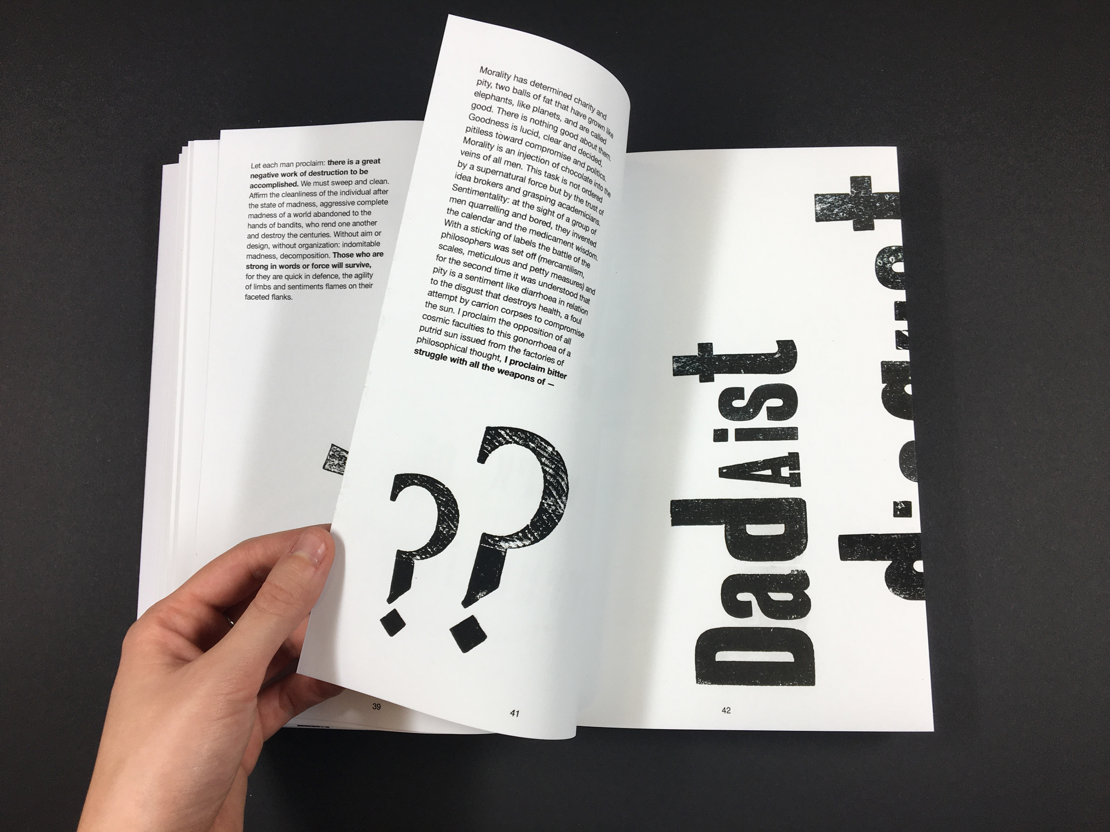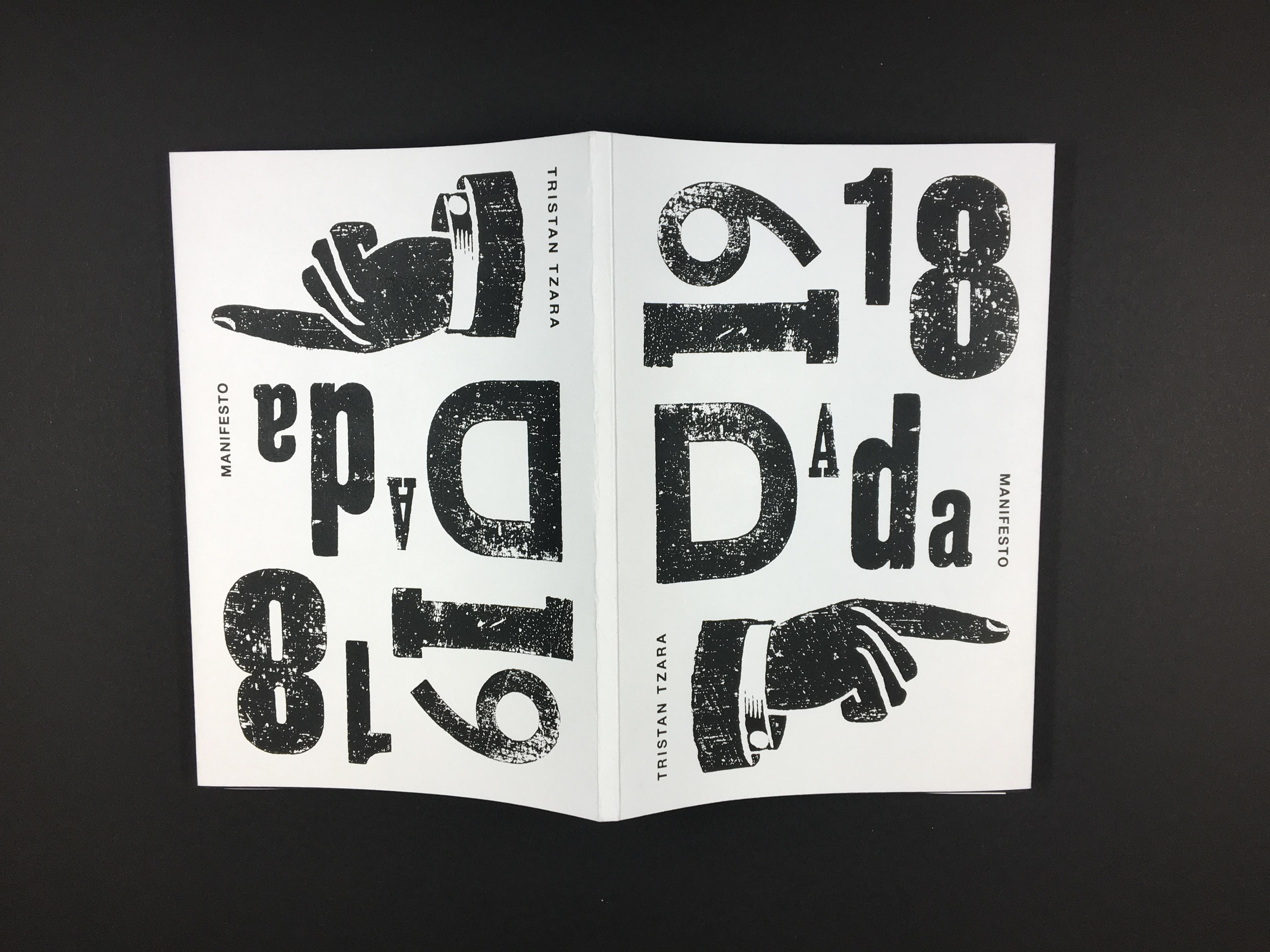 The project involved designing a book that visually interprets Tristan Tzara’s 1918 Dada Manifesto through distinctive typography and self-generated imagery. The book measures 160mm x 240mm, with French-folded pages. Woodblock letterpress was chosen to reflect the manifesto’s raw, expressive nature and to create illustrative typography aligned with the Dadaist aesthetic.